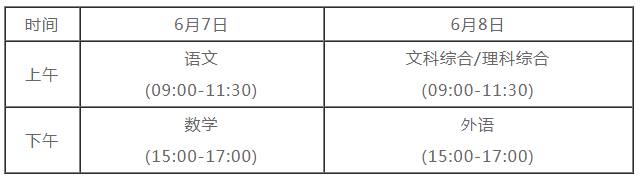 6月8日:9:00至11:30 考文科综合/理科综合科目;15:00至17:00 考外语科目,有外语听力测试内容的应安排在外语笔试考试开始前进行。