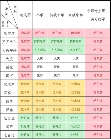 4.考区选择:面试共设哈尔滨、齐齐哈尔、牡丹江、佳木斯、大庆、绥化、黑河七个考区,考生网上报名时须根据户籍(或居住证)所在地,在校生按学籍关系所在地按《面试填报考区对照表》选择对应考区,不得跨区报考,农、林系统考生可就近选择考区报考。