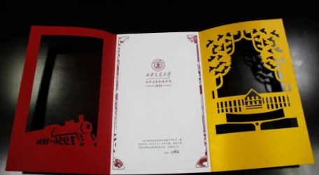 2020年西安交大录取通知书以交通大学西迁为主题,整体采用三折页内嵌形式,外层封套为录取纪念卡,封套内嵌入录取通知书。纪念卡封面为带有1956年字样的西迁专列,封二为交大西迁后建设的中心楼与栽下的梧桐树。梧桐树采用正负形设计,正形为梧桐树叶,负形也即镂空部分为报喜鸟,寓意百年交大“栽下梧桐树,引得凤凰来”的诚意。