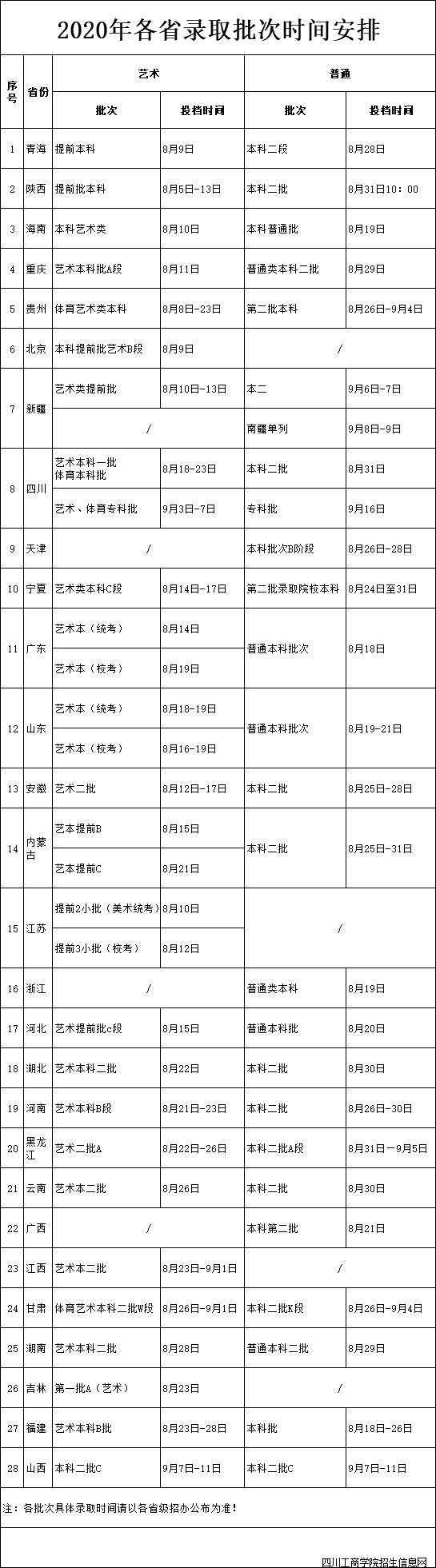2020年各省录取批次时间安排