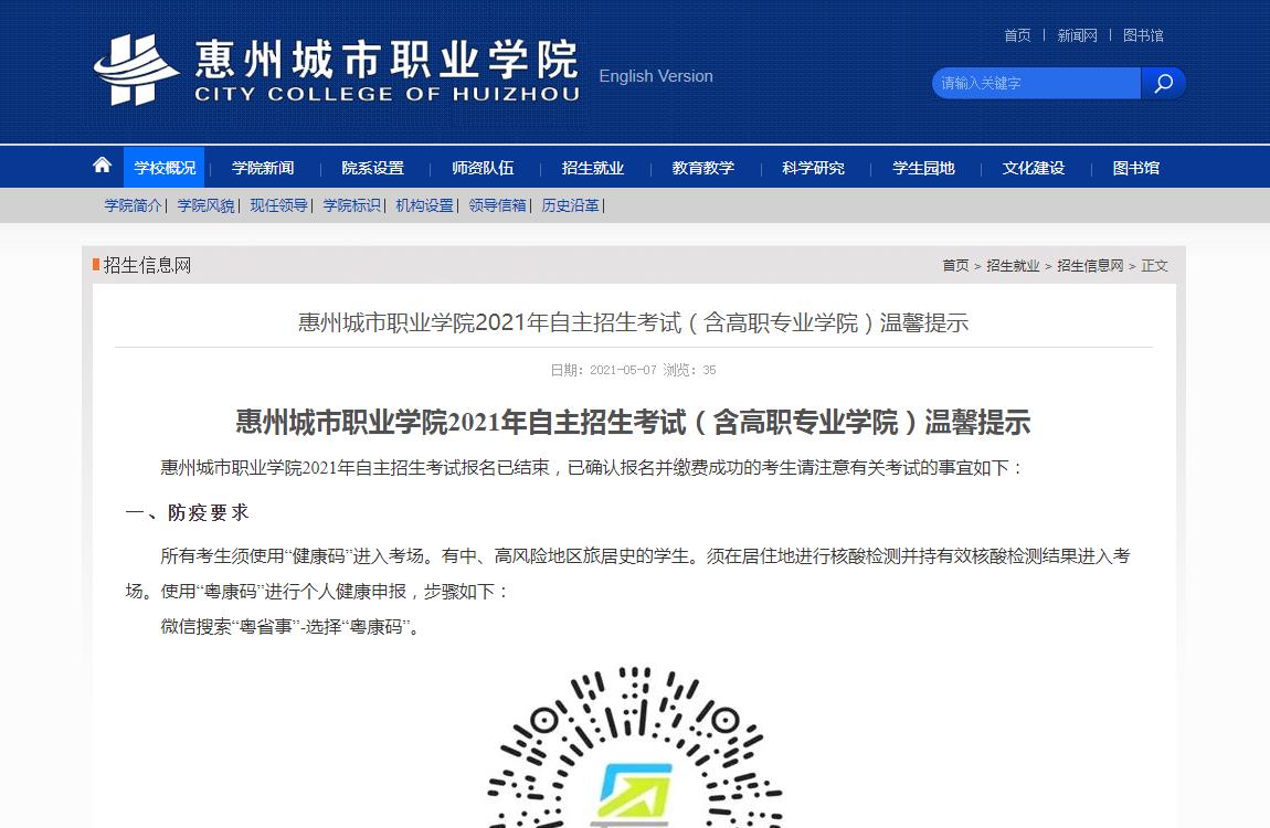惠州城市职业学院2021年自主招生考试报名已结束,已确认报名并缴费成功的考生请注意有关考试的事宜如下: