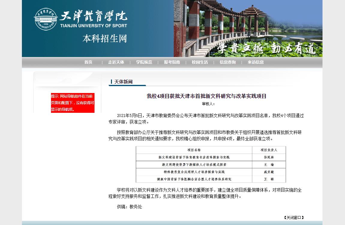 2021年5月6日,天津市教育委员会公布天津市首批新文科研究与改革实践项目名单,我校4个项目通过专家评审,获准立项。