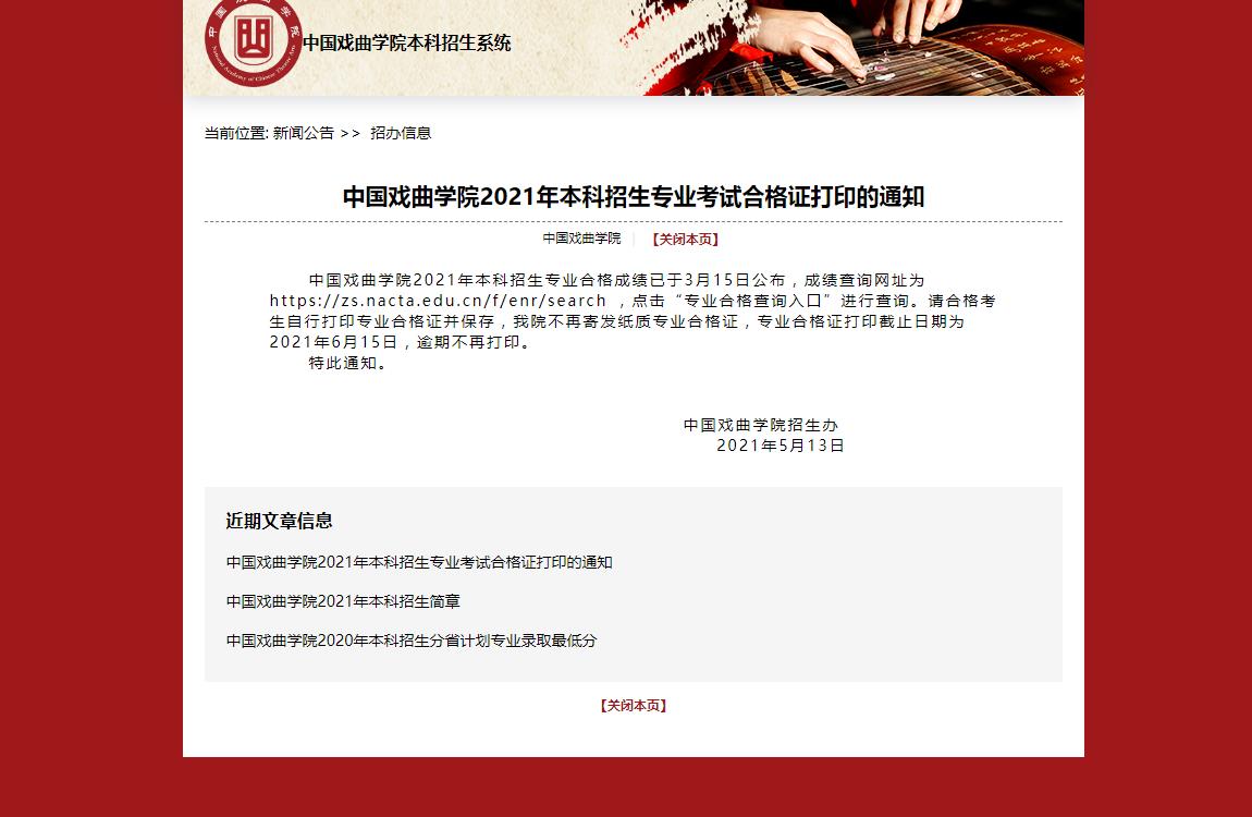中国戏曲学院2021年本科招生专业考试合格证打印的通知 2021-05-13