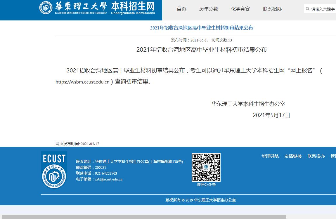 2021招收台湾地区高中毕业生材料初审结果公布,考生可以通过华东理工大学本科招生网“网上报名”( https://wsbm.ecust.edu.cn)查询初审结果。