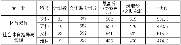 2.我校进档考生按照专业志愿顺序安置专业。考生第一专业志愿无法录取的,同意专业调剂的,则安置到第二专业,直至录取额满。排序成绩低的考生做退档处理。我校第一专业志愿“体育教育”(文科)录取分为515分,第一专业志愿为“社会体育指导与管理”(文科)录取分为501分,第二专业志愿为“社会体育指导与管理”(文科)的录取分为508分(该生专业课成绩116分)。第一专业志愿“体育教育”(理科)录取分为476分(该生专业课成绩122分),第一专业志愿“社会体育指导与管理”(理科)录取分为460分,第二专业志愿为“社会体育指导与管理”(理科)录取分为470分。