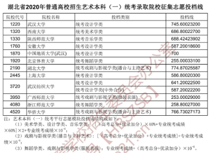 湖北省2020年普通高校招生艺术本科(一)统考录取院校征集志愿投档线公布,下面是具体投档情况,供参考。