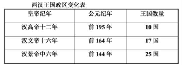 【详解】材料体现的是从公元前195年到前144年,西汉的王国数量明显增加,这说明王国的力量有所分散,强调的是推行“推恩令”的条件更加成熟,A正确,D排除;材料未涉及中央内部行政体制调整的问题,B排除;郡国并行制是在已有的疆域推行的,C排除。故选A。