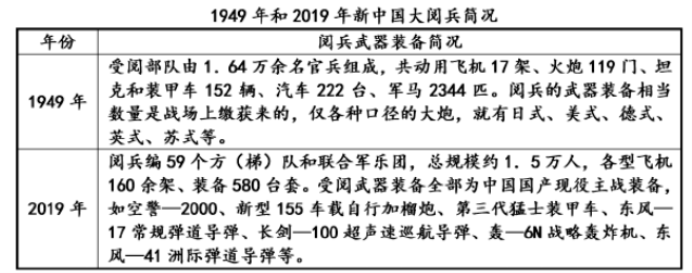 示例二:2019年阅兵与1949年阅兵相比,充分展示了我国新时期社会主义建设的巨大成就。1949年开国大典阅兵,全国尚未完全解放,国民经济千疮百孔,国家一穷二白。阅兵的武器装备相当数量来自战场缴获,是“凑"出来的“万国牌”装备,尤其是体现军事力量的飞机、坦克数量较少。改革开放后,我国经济迅速发展,综合国力不断增强。伴随科教兴国战略的实施,军事科技突飞猛进。2019年大阅兵大量因产先进武器装备的展示,充分反映了我国新时期社会主义建设的巨大成就,更加激发了全国各族人民为实现中华民族伟大复兴而努力奋斗的热情。