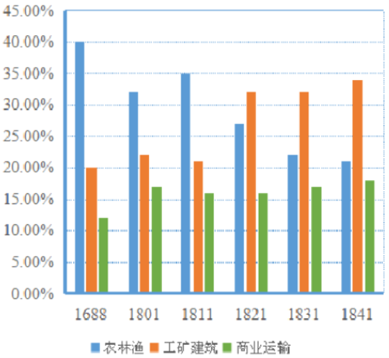 21.下图是1688—1841年英国主要经济部门的产值在国民生产总值中的比例情况。图中现象反映了英国( )