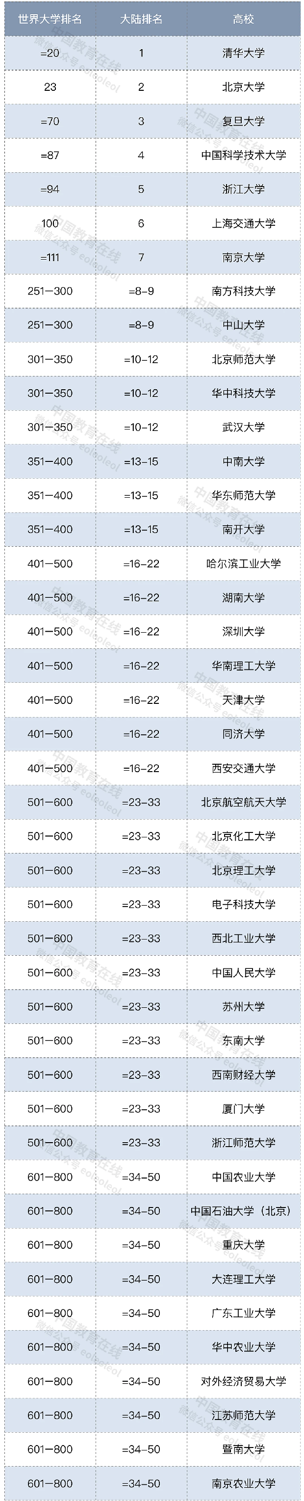近日,《泰晤士高等教育世界大学排名》发布。清华大学成为2011年后第一个进入排名前20的亚洲大学。北京大学位列第23名,复旦大学排在世界第70名,浙江大学位列第94位,上海交通大学排名第100。