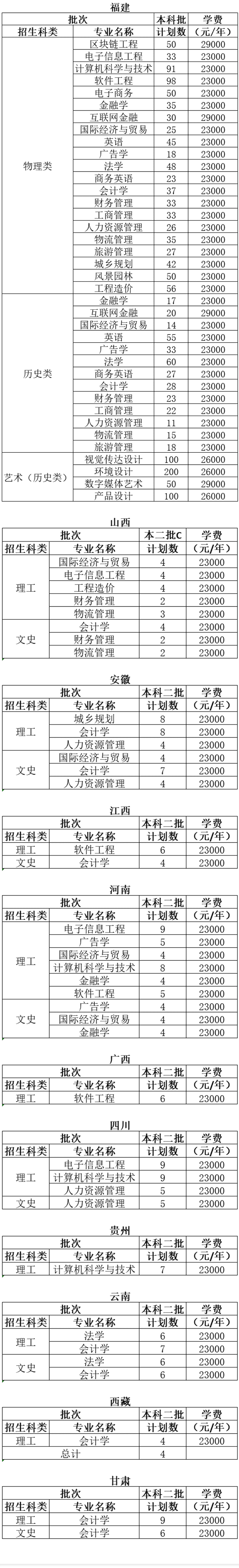 福州工商学院2021年普通本科招生计划