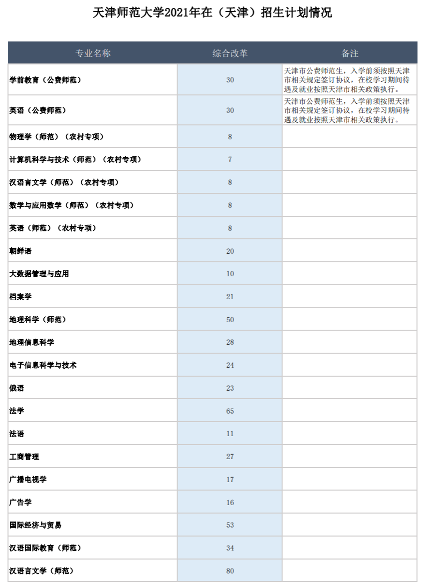 2021年天津师范大学招生计划已经公布,以下是天津市各专业招生人数,这是填报志愿时非常重要的参考数据,供大家参考,如有变动,以学校官方公布为准: