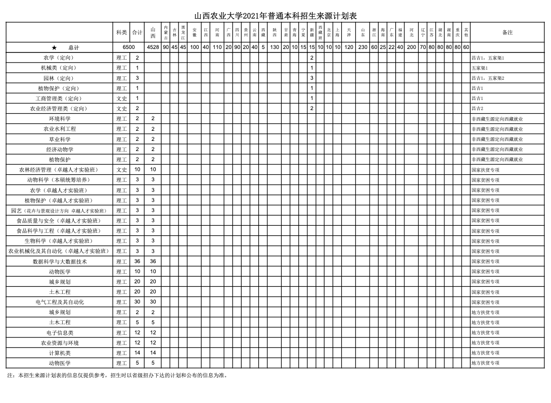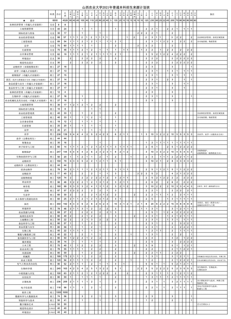山西农业大学2021年普通本科招生来源计划表