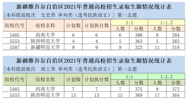 新疆维吾尔自治区2021年普通高校招生投档情况统计-单列类(选考民族语文)本科提前批次已经公布,下面是详细信息,来看一下!