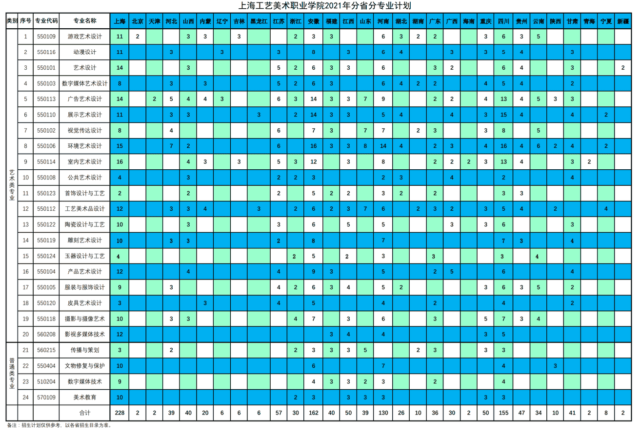 2021年上海工艺美术职业学院招生计划已经公布,以下是上海市及全国各专业招生人数,这是填报志愿时非常重要的参考数据,供大家参考,如有变动,以学校官方公布为准: