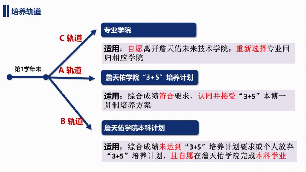 为了保障詹天佑学院学生培养的多样性和归属感,没有进入A轨的詹天佑学院的学生在第二学年前,既可以申请进入詹天佑学院本科计划(B轨)学习,即在詹天佑学院完成本科学业,获得本科学位,也可以选择进入专业学院学习(C轨)。