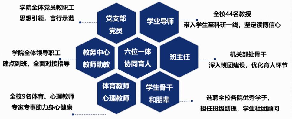 学院创新三全育人工作机制,形成六位一体协同育人局面。学院教职工党员全员参与学生党建工作,积极做好思想引领和言行示范;来自专业学院的44名教授作为学业导师,引导学生了解专业特色和学科前沿;聘请机关部处业务骨干担任班主任,深入班团建设,优化育人环节;特邀体育、心理教师担任社团顾问,助力学生身心健康;选拔34名研究生担任课程助教,固定时间、固定教师答疑;选聘全校高年级优秀学子,担任班级助理,构建榜样载体。