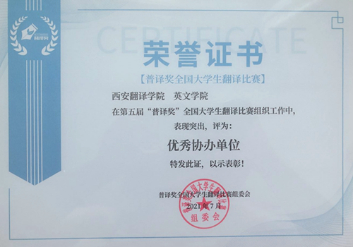 第五届“普译奖”全国大学生翻译比赛决赛结果近日揭晓,西安翻译学院英文学院英语专业学生继获得第四届全国英译汉组一等奖后,此次又斩获汉译英组全国一等奖1名、英译汉组全国二等奖1名以及英译汉组全国三等奖2名的好成绩。西安翻译学院英文学院被评为“优秀协办单位”,章洁、王小娟老师被评为“优秀指导老师”,贺融、张晓霜、赵子涵同学为评为“优秀志愿者”。
