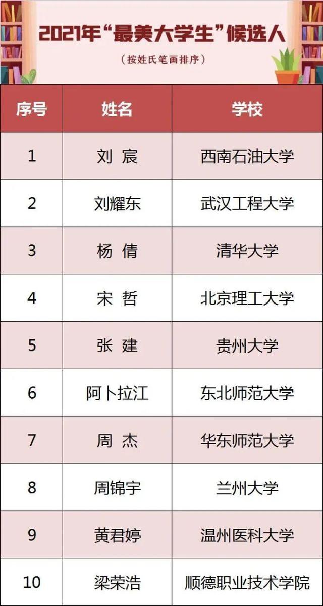 近日,教育部公示2021年“最美大学生”候选人名单,共10人入选。公示期为2021年10月27日—11月2日。
