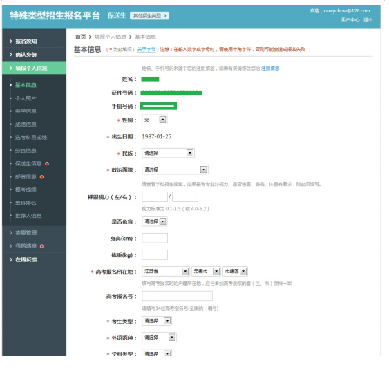 将左侧栏中的确认身份、个人信息填写完整(基本信息、个人照片、中学信息、成绩信息、选考科目信息(上海、浙江、北京、天津、山东、海南、河北、辽宁、江苏、湖南、湖北、广东、重庆和福建的生源学生须填写此栏目)、综合信息、保送生信息、邮寄信息、模考成绩、单科排名等)。