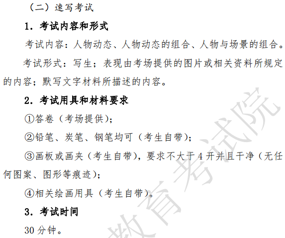 广东省2021年普通高等学校招生统一考试美术术科考试说明发布,考试采用全自动终点摄像计时装置计取成绩。若全自动终点摄像计时装置出现故障,无法计取成绩时,则重新安排该组考试。成绩以对应的得分计取,若成绩在评分标准的两个相邻分值之间,则计取其中较低的分值。