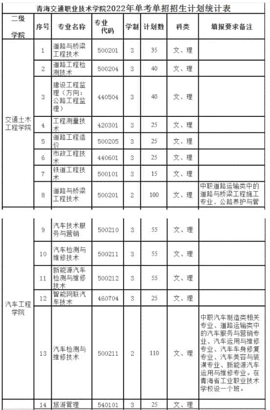 2022青海交通职业技术学院高职单招招生专业道路与桥梁工程技术、道路工程检测技术、工程测量技术、汽车技术服务与营销、智能网联汽车技术、新能源汽车检测与维修技术等。