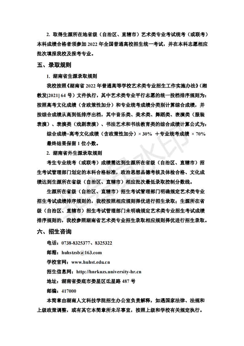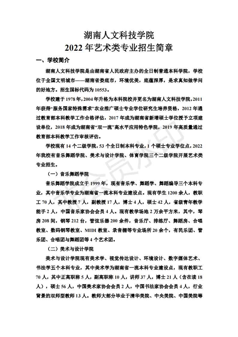 湖南人文科技学院是由湖南省人民政府主办的全日制普通本科学院,学校现有14个二级学院,53个全日制本科专业,1个硕士专业学位点。每年学校都会招收一批艺术类考试,目前2022年的艺术类招生简章已经公布了,小编将其整理如下,一起来看看吧!