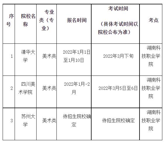 1.根据教育部和我省艺术类专业招生有关政策规定,经有关高校申请,我省同意下述高校2022年来湘设点组织艺术类专业校考。