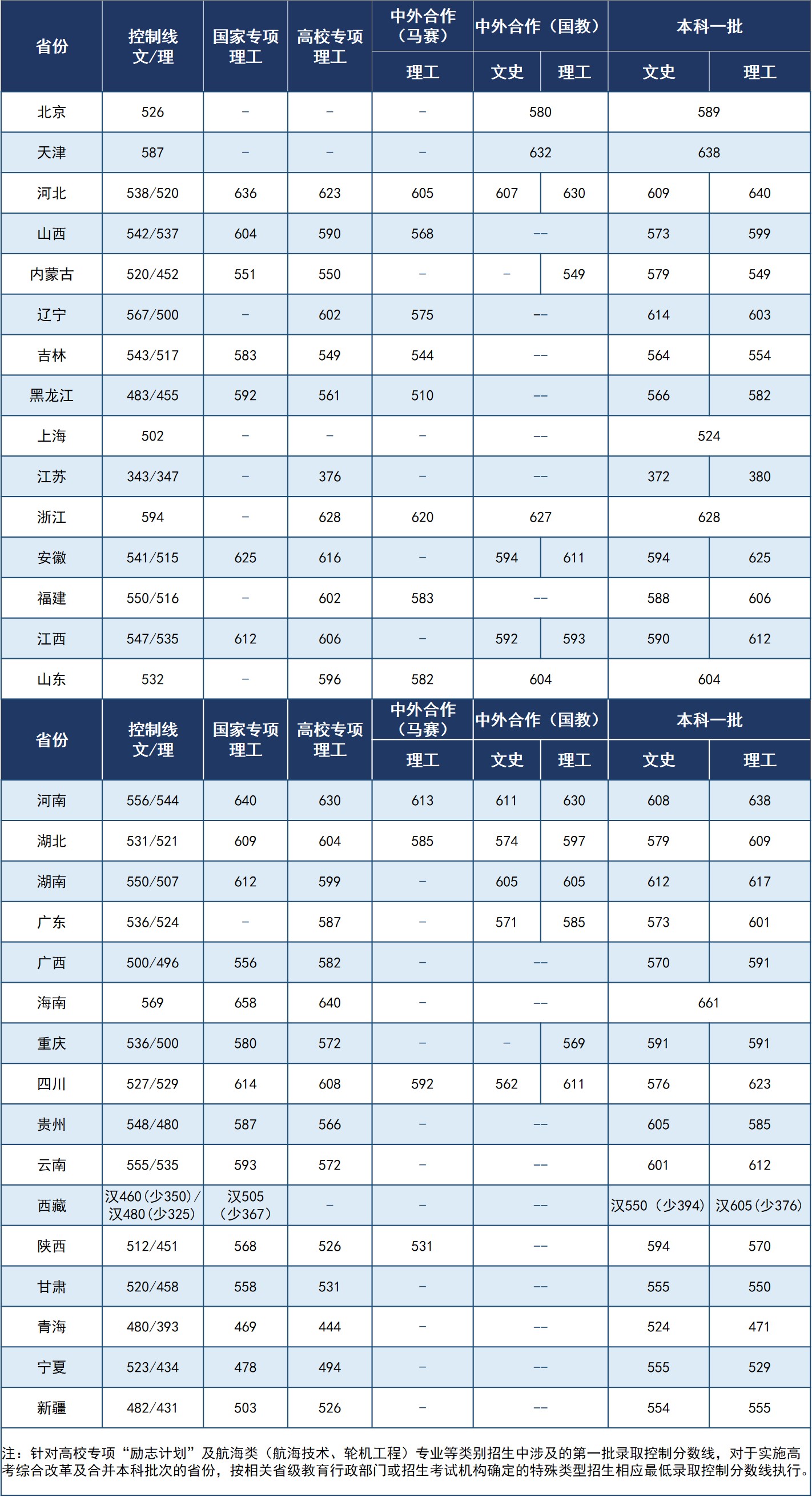 2.武汉理工大学国家专项、高校专项、中外合作、本科一批录取分数线统计