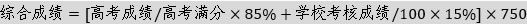 综合成绩(总分750.00分,精确至小数点后两位)由高考成绩(不含任何政策加分)和学校考核成绩两部分组成,折算办法如下: