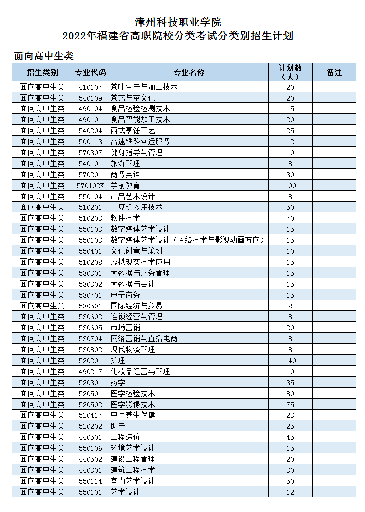 2022漳州科技职业学院高职分类考试招生专业及计划