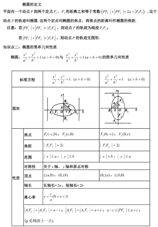 椭圆是平面内到定点F1、F2的距离之和等于常数(大于|F1F2|)的动点P的轨迹,F1、F2称为椭圆的两个焦点。其数学表达式为:|PF1|+|PF2|=2a(2a>|F1F2|)。