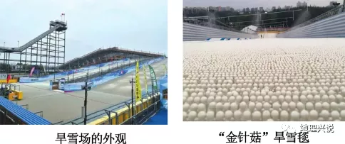 谷爱玲获第24届女子滑雪大跳台比赛冠军,在她参加冬奥会之前,曾在成都某旱雪场秘密集训了五天时间。该旱雪场采用我国自主研制的世界上最先进的“金针菇”旱雪毯技术,以及专用配套设备,让滑雪者获得“高仿真”的滑雪体验。下图为旱雪场的外观(左图)和“金针菇”旱雪毯(右图)。据此完成下面小题。