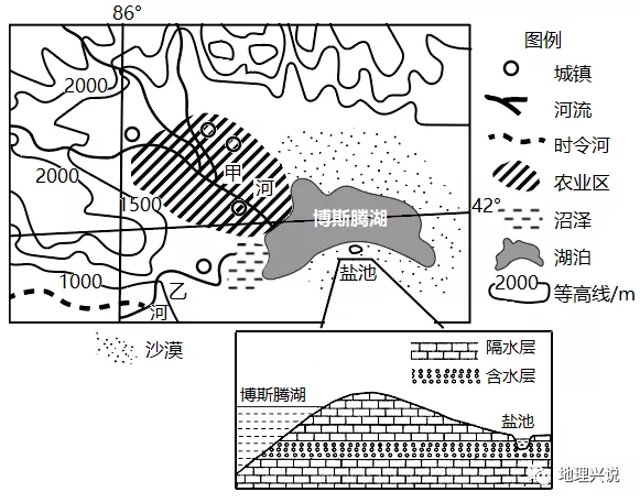 9.据图可知,甲河流入博斯腾湖,乙河流出博斯腾湖,由于甲河支流较多,主要靠高山冰雪融水补给,夏季流量大,其它季节流量较小,乙河有博斯腾湖补给,受湖泊调节作用明显,流量季节变化较小,故甲河径流量和水位季节变化均大于乙河,A正确,C错误;甲河有高山冰雪融水补给且海拔较高,水温较低,上游落差大,中下游有农业区,河流含沙量较大,乙河上游有低洼沼泽,吸附沉积作用明显,河流含沙量较小,海拔较低,水温较高,BD错误;故选A。