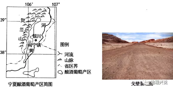 材料一:贺兰山东麓分布着大片的戈壁滩。戈壁滩是沙石混杂堆积体,地表覆盖着砾石,距山体越远砾石越小,砾石磨圆度较高。位于该地区的闽宁镇,在1996年以前曾是荒芜的“干沙滩”。在福建对口帮扶下,从西海固搬迁来的生态移民们根据当地的气候、土壤条件,建立起了葡萄、枸杞及葡萄加工酿造等特色产业,使闽宁镇成为生态移民示范镇。下图为宁夏酿酒葡萄产区简图(左图)及戈壁景观图(右图)。