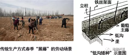 材料二:贺兰山东麓种养葡萄采用“冬藏埋土(冬季将葡萄主藤埋进土里),迎春展藤”的生产方式,可使葡萄藤抵御极端低温天气越冬。某公司在该地采用“低沟矮种”的生产技术,将葡萄种在沟中,主藤沿最矮铁丝延展。(下图中左图为传统生产方式春季“展藤”的劳动场景,右图为“低沟矮种”示意图)。
