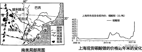 (2)评价南美三国开发利用锂的条件既要分析其有利条件,也要分析其不利条件。有利条件:“南美洲玻利维亚、阿根廷和智利三国交界的盐湖中锂储量约占全球的58%”,可见南美三国锂的储量巨大,分布较集中,在国际市场上有较强的议价能力;根据右图可知,现货碳酸锂的价格上涨快,开发锂可快速收回投资,获得高额利润;“广泛用于电动汽车、航空航天、风光储能等”,可见锂的用途广泛,储能优势明显,国际市场需求量大;盐湖附近有铁路,开发利用锂的交通比较方便,且有政府政策支持等。不利条件有:南美三国经济欠发达,技术水平较低,不具有独立开发能力;位于山区,地形地势复杂,空气稀薄,昼夜温差大,自然环境恶劣,开发难度大;当地生态环境脆弱,大型的开发建设易造成严重的环境污染和生态破坏,不利于区域可持续发展。