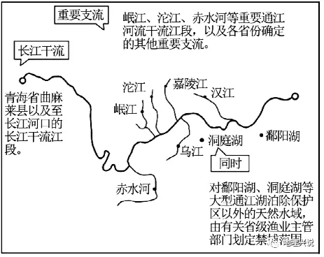长江是世界上水生生物多样性最为丰富的河流之一,浩浩江水哺育着424种鱼类,光特有鱼类就有183种,是全球七大生物多样性丰富河流之一。在过去几十年,许多人竭泽而渔,采取“电毒炸”“绝户网”等非法作业方式,最终形成“资源越捕越少,生态越捕越糟,渔民越捕越穷”的恶性循环,长江生物完整性指数已经到了最差的“无鱼”等级。2020年1月农业农村部发布《长江十年禁渔计划》规定长江干流和重要支流除水生生物自然保护区和水产种质资源保护区以外的天然水域,最迟自2021年1月1日0时起实行暂定为期10年的常年禁捕,期间禁止天然渔业资源的生产性捕捞。下图为长江十年禁渔范围示意图。