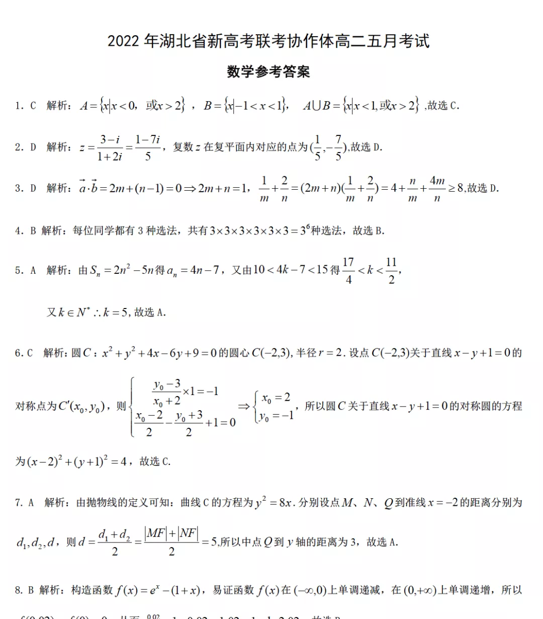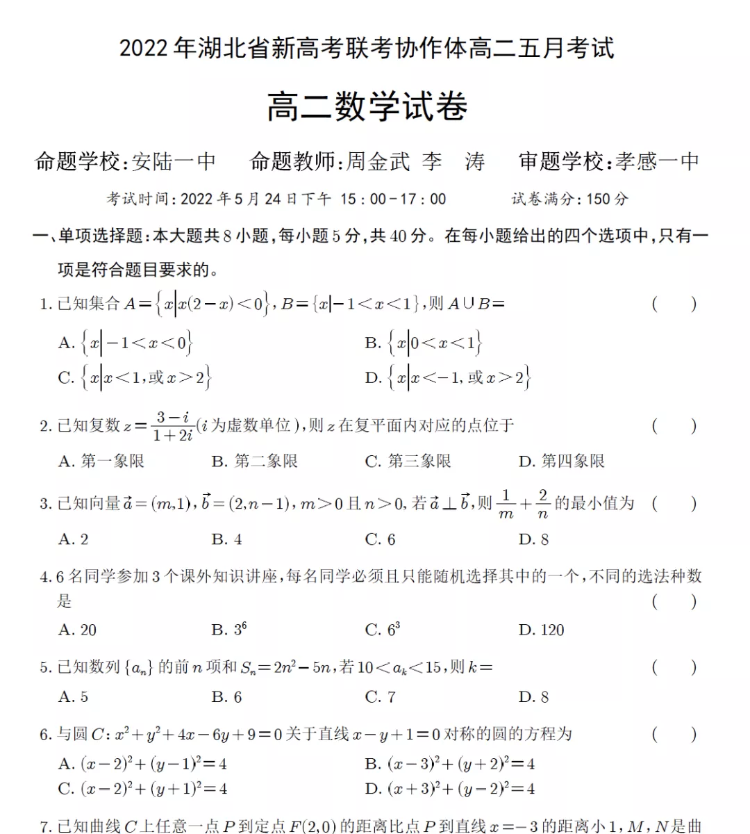 2022湖北省新高考联考协作体高二五月考试数学试卷及答案