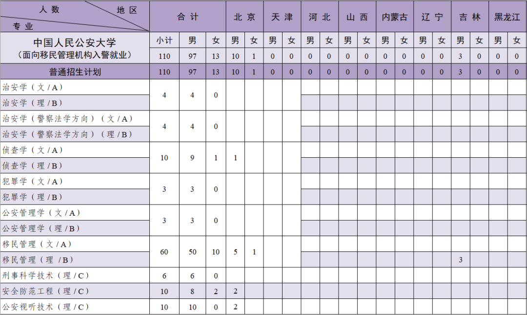 3、西藏计划中含内地西藏班计划 10 人。其中:男生8 人,即治安学(文)1 人、治安学(理)1 人、侦查学(文)1 人、侦查学(理)2 人、公安管理学(文)1 人、公安管理学(理)1 人、交通管理工程(理)1 人;女生 2 人,即治安学(文)1 人、交通管理工程(理)1 人。