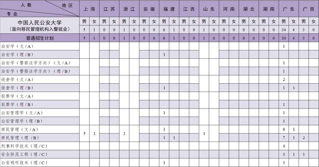 4、新疆计划中含新疆高中班计划 16 人。其中:男生 14 人,即治安学(文)1 人、治安学(理)1 人、治安学(警察法学方向)(文)1 人、治安学(警察法学方向)(理)1 人、侦查学(文)1 人、侦查学(理)1 人、公安管理学(文)1 人、公安管理学(理)2 人、公安政治工作(文)1 人、公安政治工作(理)1 人、交通管理工程(理)3 人;女生 2 人,即治安学(理)1 人、侦查学(理)1 人。