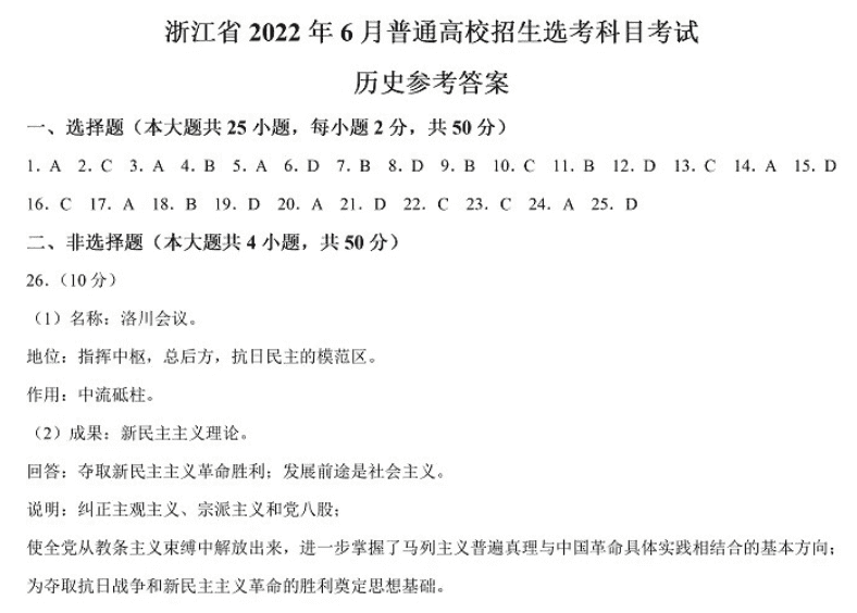 2022年浙江高考历史试题答案解析(浙江卷)