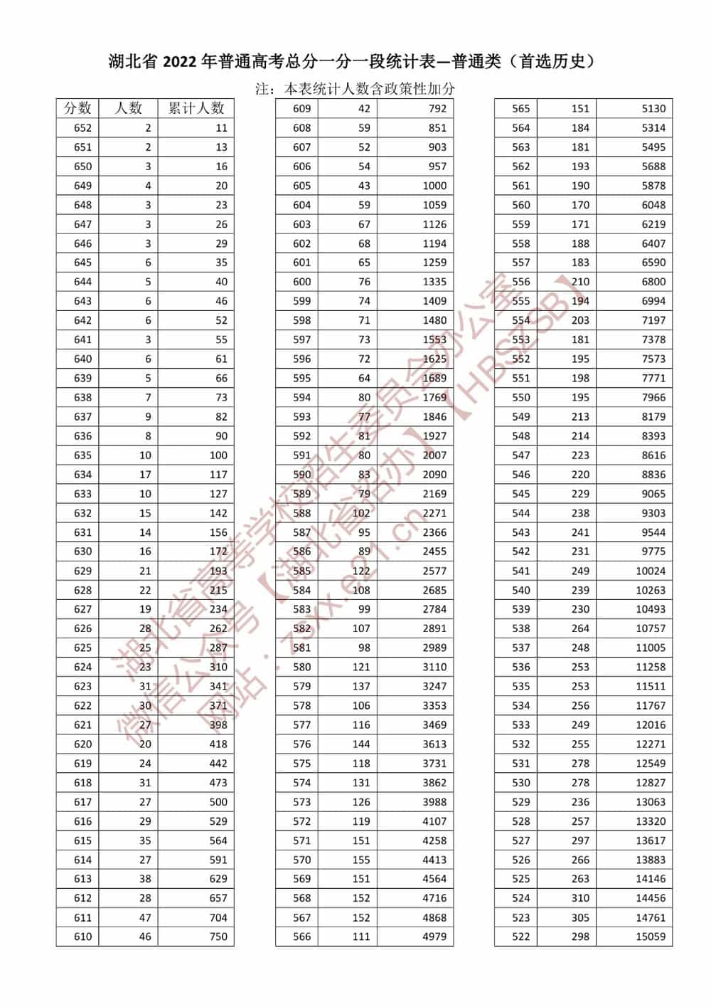 2022湖北省高考成绩总分一分一段统计排名汇总表(历史+物理)