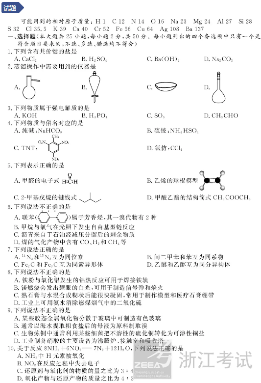 浙江省新阵地教育联盟2025届高三第一次联考化学试题及答案