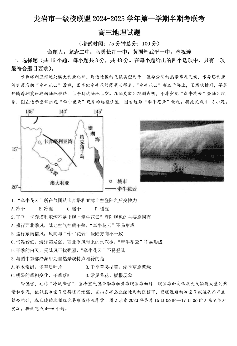 福建龙岩一级校联2025届高三上11月期中地理试题及答案