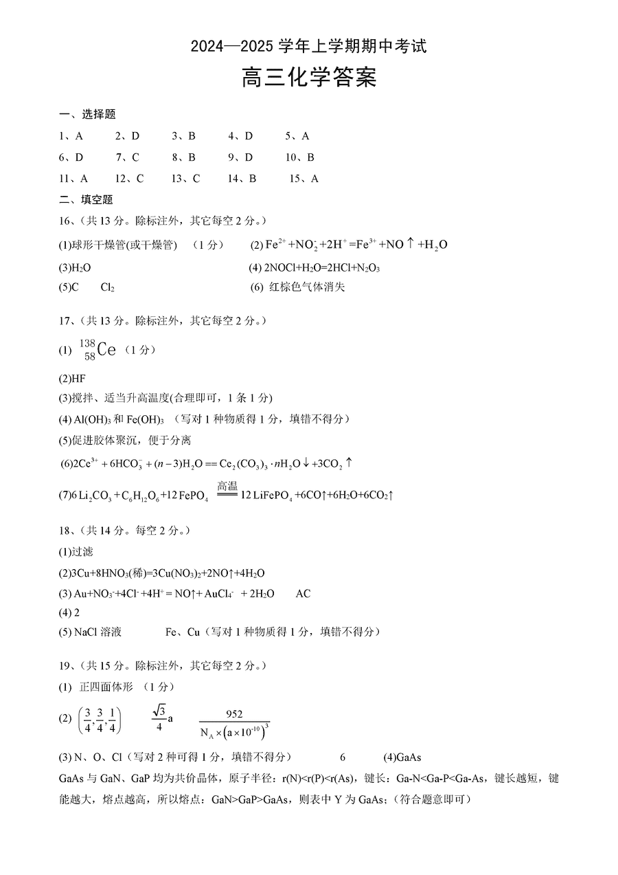 湖北省新高考协作体2025届高三期中化学试题及答案