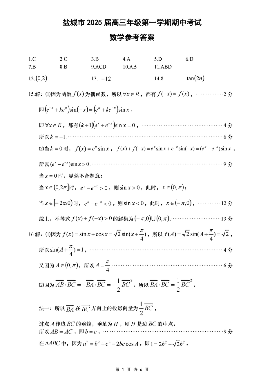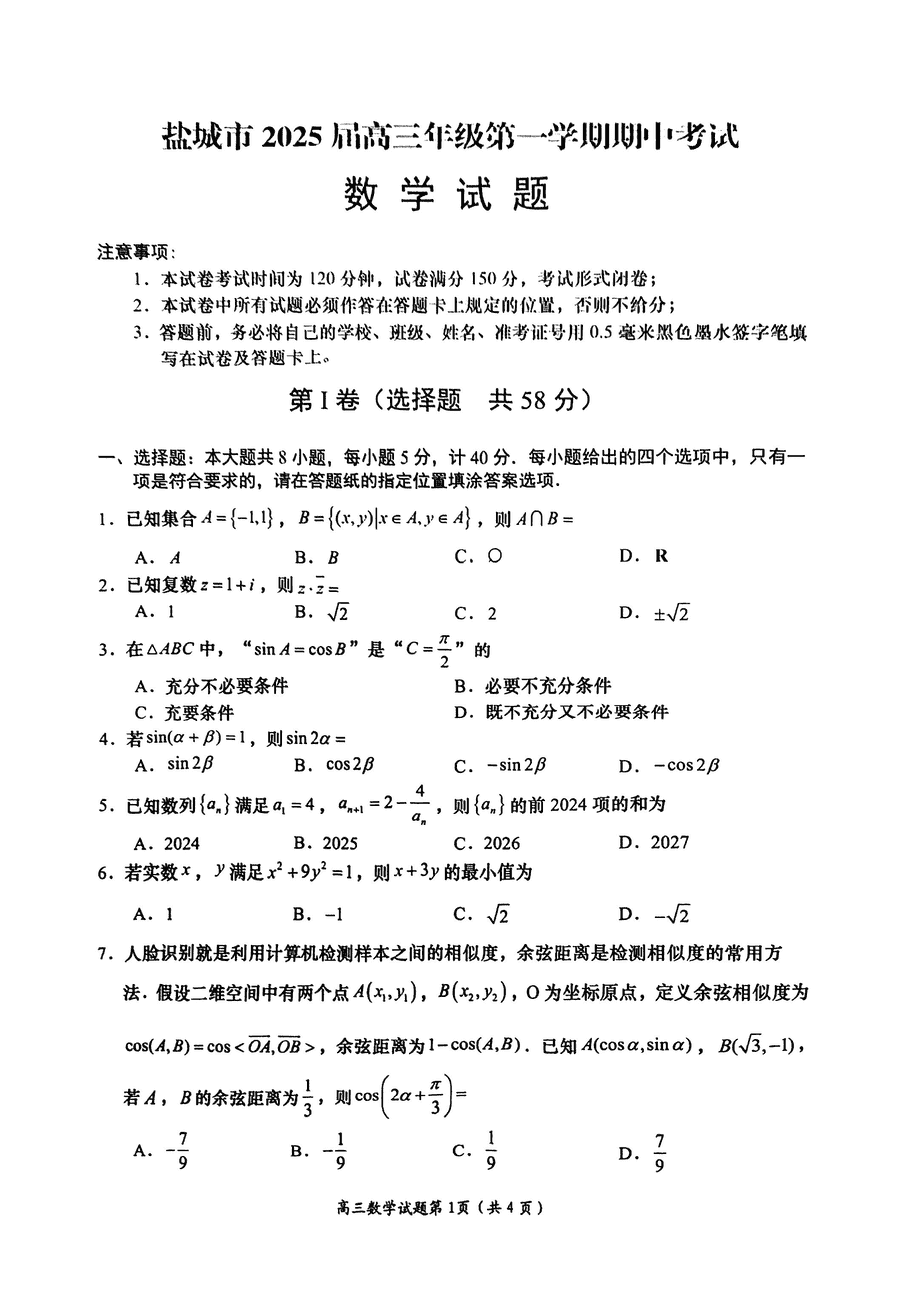 江苏盐城2025届高三上学期11月期中数学考试已于近日开考,为方便考生考后及时查看考试情况,查漏补缺、弥补不足,本文整理了试题答案解析相关信息!
