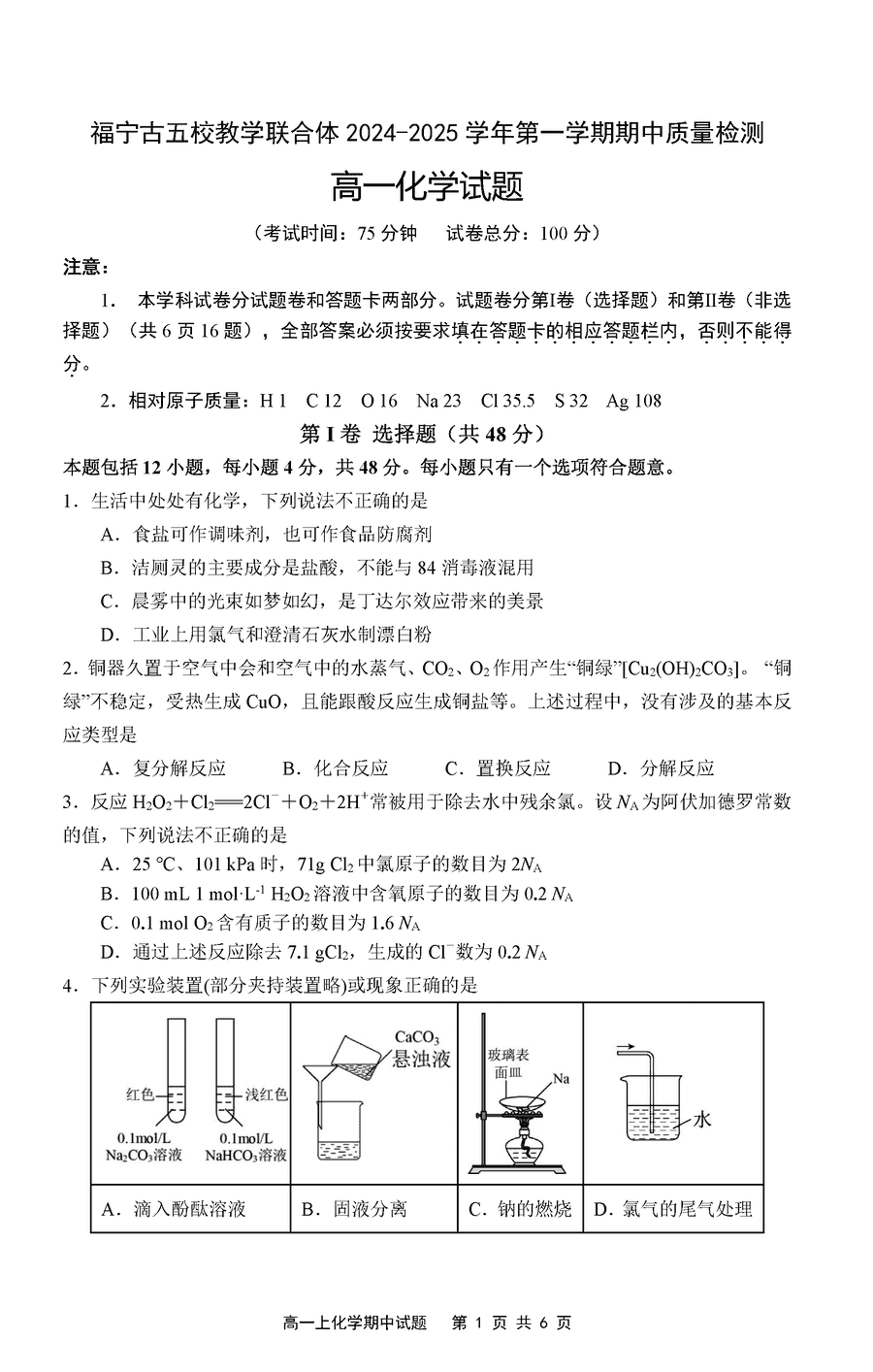 福宁古五校教学联合体2024-2025学年高一上学期期中化学试题及答案