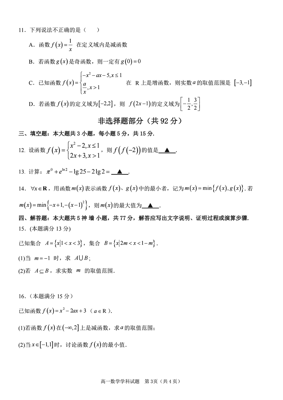 嘉兴八校2024-2025学年高一期中数学试题及答案