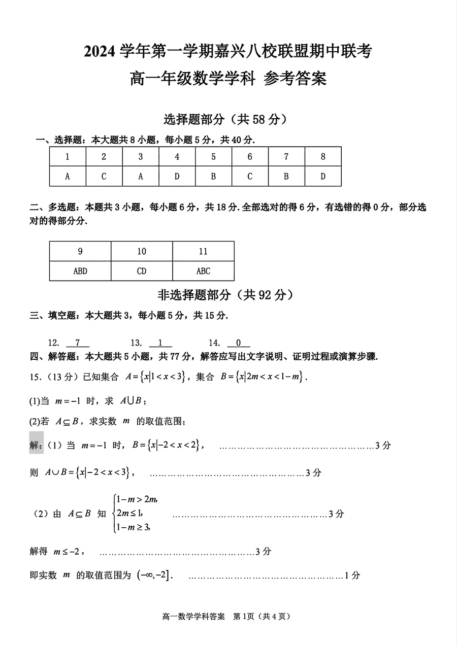 浙江省嘉兴八校2024-2025学年高一期中数学考试已于近日开考,为方便考生考后及时查看考试情况,查漏补缺、弥补不足,本文整理了试题答案解析相关信息!